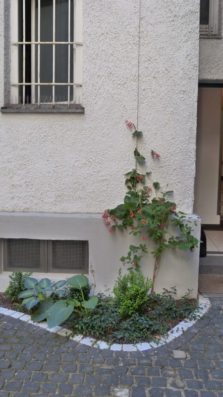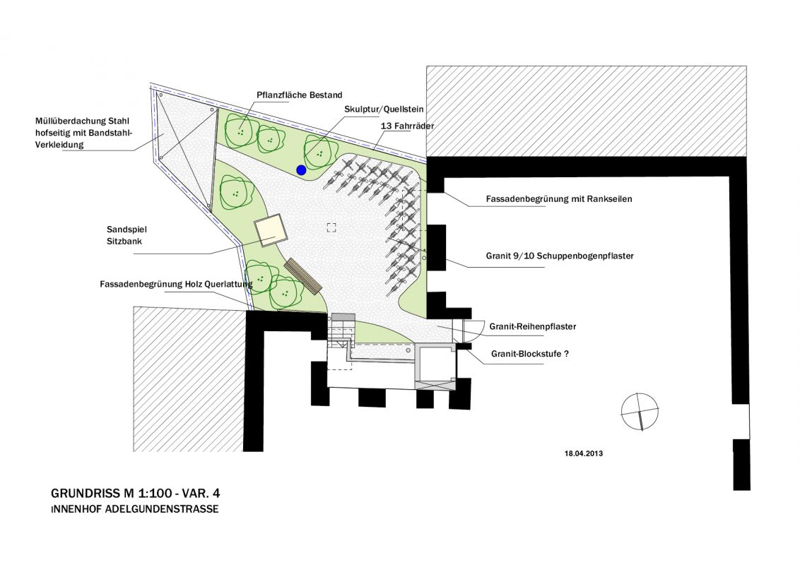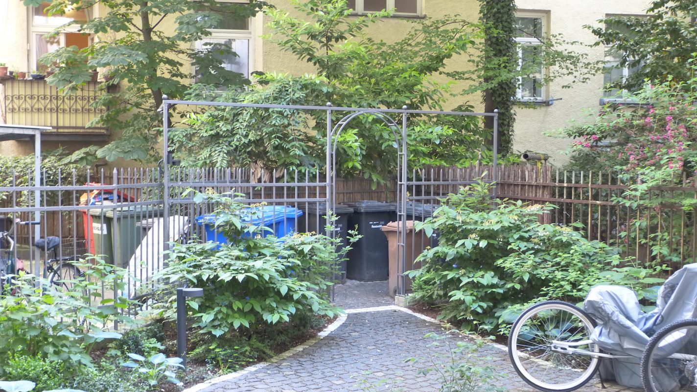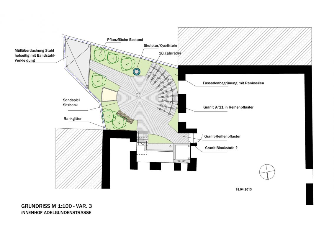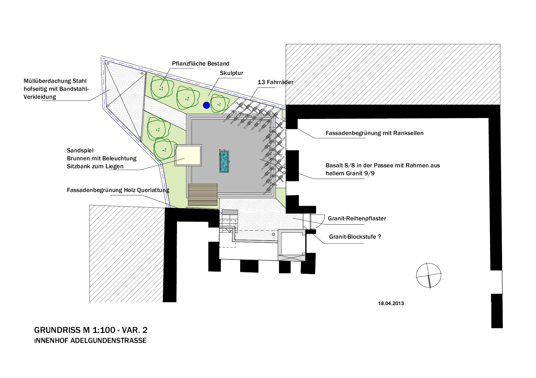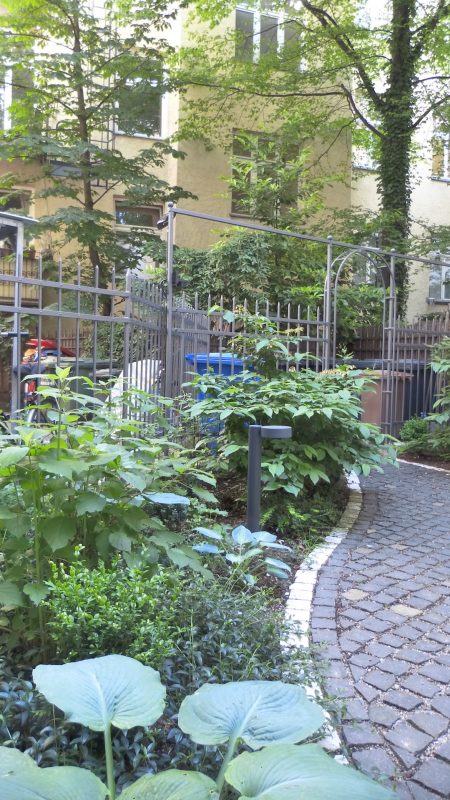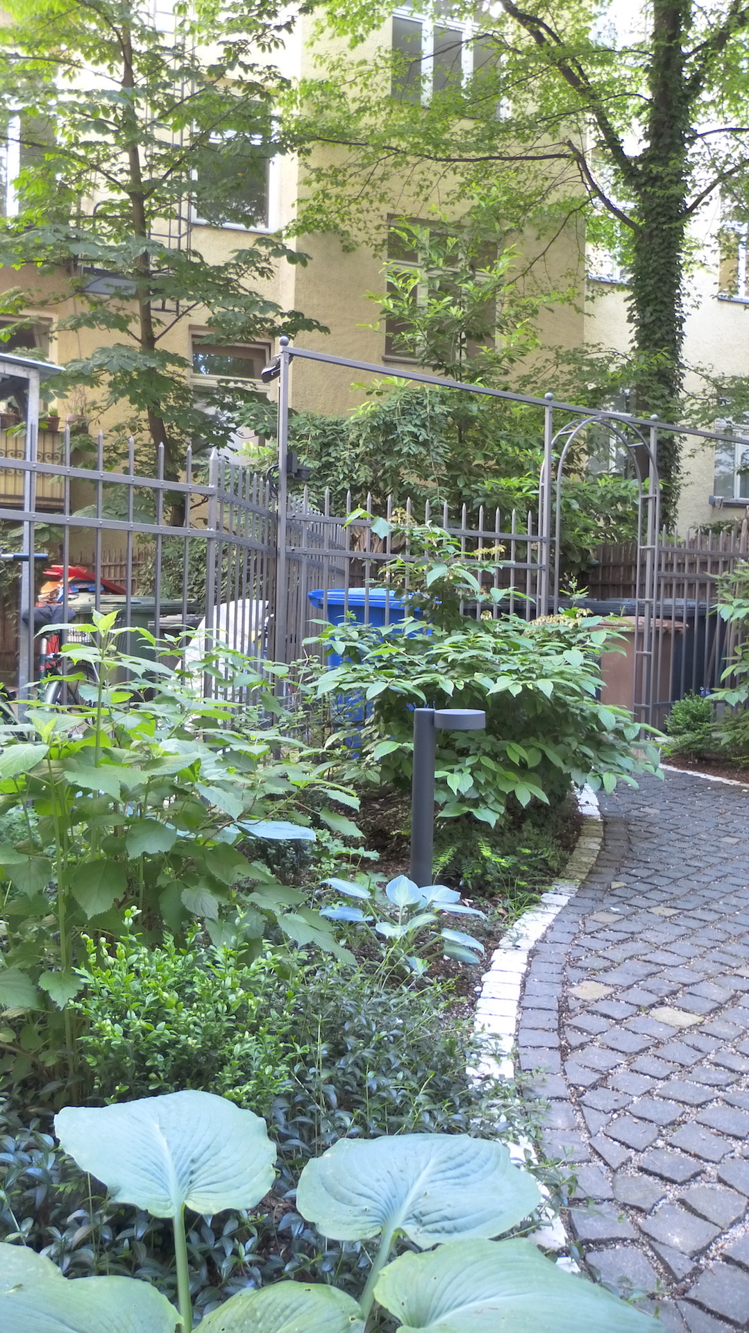 Dieser winzige, schattige Innenhof ist von einer prächtigen Rot-Buche überstellt. Nach Abschluß der Fassadenrenovierung wurde der Innenhof umgestaltet. Die hochwertige, elegante Gestaltsprache des Gebäudes wurde durch die Pflasterfläche aus Basaltstein mit einer weißen Marmorsteineinfassung fortgesetzt. Die Mitte des Hofes bildet ein Buchsbaum-Karree. Das Rankgitter zum Müllunterstand wurde neu errichtet und nimmt die Formensprache des vorhandenen Zaunes auf. Der Zaun wird mit immergrünen Sträuchern vorgepflanzt und mit Kletterpflanzen berankt, welche als Sichtschutz in die angrenzenden Höfe dienen.